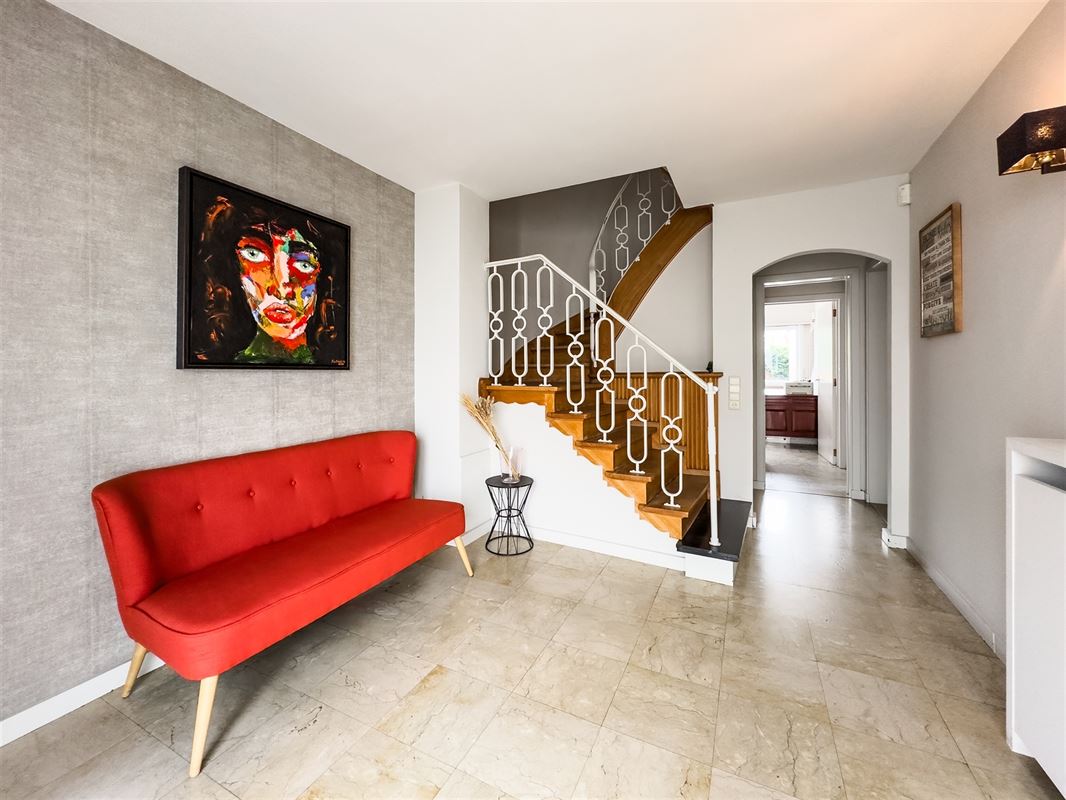 De ruime inkomhal geeft toegang naar de garage, de tuin alsook naar een extra studio/ multifunctionele ruimte, ideaal voor gebruik als praktijkruimte of kangeroe wonen. Deze extra ruimte is uitgerust met ingemaakte kasten en een badkamer. Aansluitend bevindt zich achteraan nog een extra kamer met zicht op de tuin.